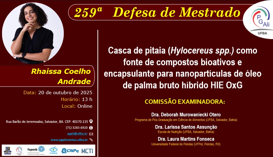 A pitaia, ou fruta-do-dragão, é uma cactácea tropical amplamente cultivada e comercializada, cujas cascas representam um subproduto agroindustrial ainda pouco explorado. Apesar de serem comumente descartadas, essas cascas são fontes ricas em compostos bioativos, como antioxidantes, antimicrobianos, pectina e mucilagem, com grande potencial de aplicação em diferentes setores. A primeira etapa deste trabalho consistiu em uma revisão de literatura sobre os principais compostos extraídos das cascas de diferentes espécies de pitaia, bem como os métodos empregados para sua extração e purificação. Essa revisão destacou o avanço de técnicas de extração assistidas por ultrassom, micro-ondas e ácidos orgânicos, que proporcionam maiores rendimentos e sustentabilidade ao processo. Além disso, evidenciou o uso crescente desses compostos em áreas como encapsulação, formulação de filmes e tratamento de efluentes, reforçando seu potencial ambiental e tecnológico. Na segunda etapa, foi desenvolvido um estudo experimental voltado à elaboração e caracterização de nanopartículas de óleo de palma bruto híbrido, utilizando a casca liofilizada de pitaia vermelha (Hylocereus polyrhizus) como material encapsulante. O planejamento fatorial resultou na seleção da formulação composta por 150 mg de óleo e 150 mg de casca liofilizada, que apresentou alta eficiência de encapsulação (95,6 ± 2,6%) e estabilidade físico-química por 60 dias a 4 ± 1 °C. As nanopartículas mantiveram o teor total de carotenoides e betalaínas em níveis satisfatórios, além de preservar a atividade antioxidante em comparação ao óleo livre. As análises térmicas e morfológicas confirmaram a integridade estrutural das nanocápsulas, indicando o potencial da mucilagem da casca de pitaia como agente encapsulante natural e sustentável. Os resultados obtidos demonstram que a valorização de coprodutos vegetais, como a casca de pitaia, pode representar uma alternativa viável para o desenvolvimento de sistemas biotecnológicos inovadores e ambientalmente responsáveis.